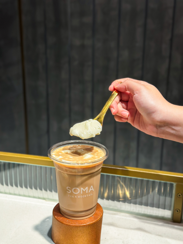 絹豆花茶歐雷(NT$85)以SOMA經典茶歐雷為基底,搭配山海豆花每日新鮮現蒸現做的天然鹽滷絹豆花,入口先是細如絹絲的豆花輕柔綻放,瞬間化開成一層滑順豆香,隨即被溫潤茶歐雷奶香輕輕包覆,兩者交融後在舌尖留下療癒香氣。凡於SOMA中山店選購茶歐雷系列飲品另可加價20元加一份絹豆花作為配料,實現「邊喝邊吃豆花」的全新體驗。
