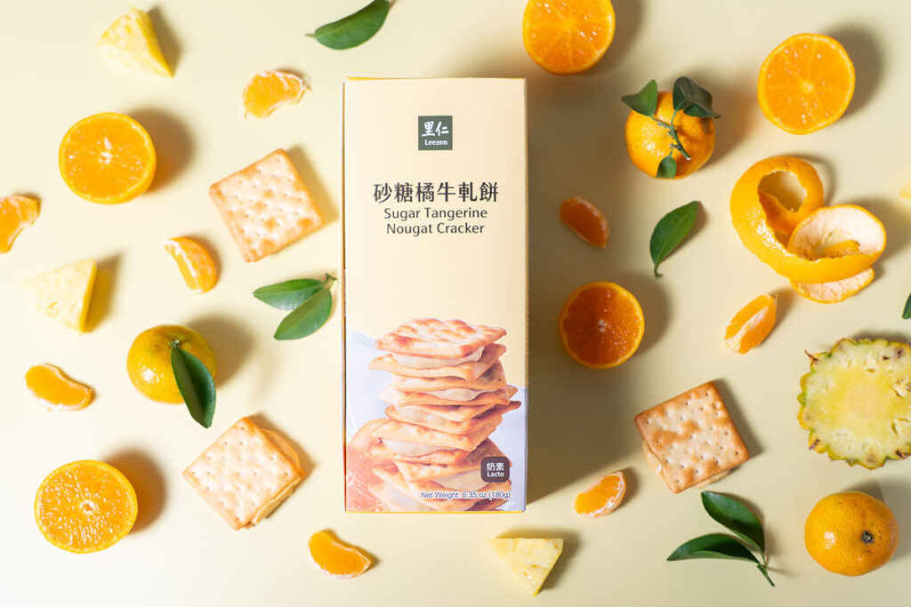 冬天是品嘗茂谷柑、臍橙、砂糖橘、虎頭柑等不同品種柑橘的時節。因此里仁與豐稷食品選定柑橘為食材,為牛軋餅增添季節風味,經過多次嘗試不同品種的柑橘,最後選定新竹關西友善栽種的砂糖橘。砂糖橘經手工剝皮去籽、細火慢熬後,搭配無蛋配方的牛軋內餡,製作出層次豐富、酸甜平衡的「砂糖橘牛軋餅」。里仁鼓勵廠商透過農產加工,提升盛產水果的價值,也讓年節點心成為支持農友的另一條穩定途徑。